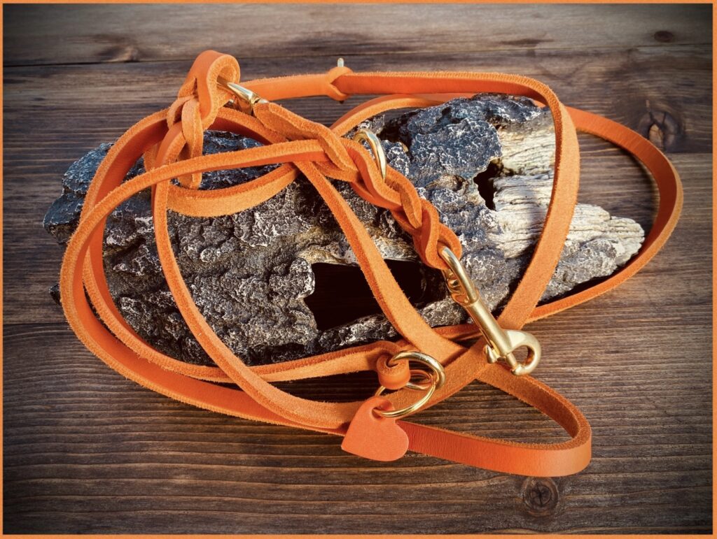 Für einen Rottweiler habe ich aus orangefarbenen Fettleder in 10mm☝️ Breite eine 2m lange, 3-fach verstellbare Leine gefertigt. Hier diesmal mit Messingbeschlägen.