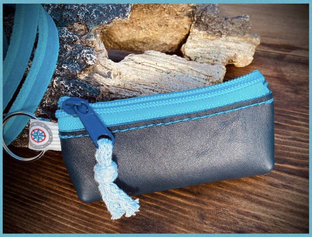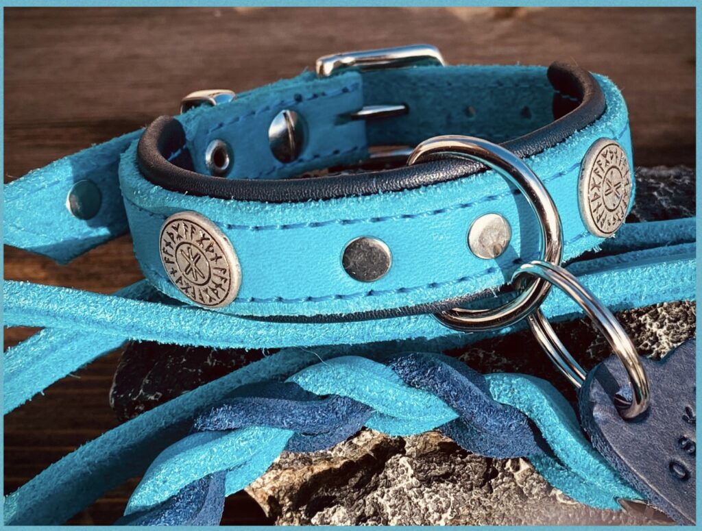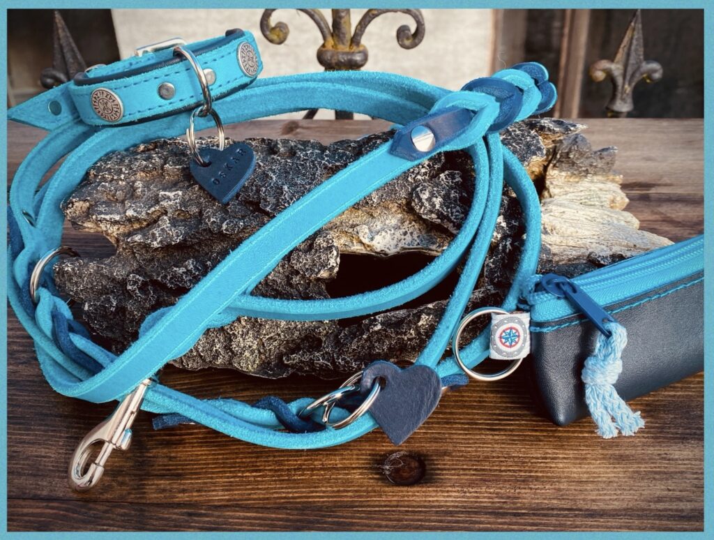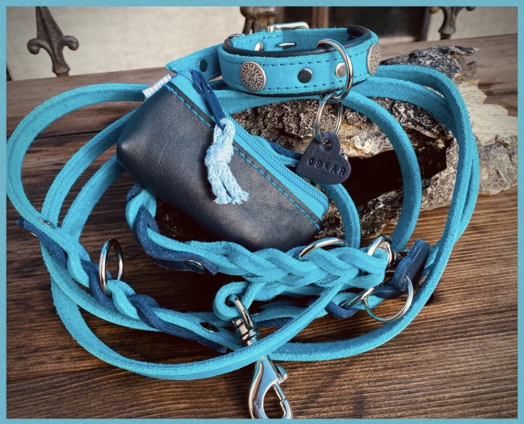 Ein türkis-/marinefarbenes Set aus Leine, Halsband und☝️Lederkotbeuteltäschchen bekommt der kleine Wuschel Oskar von Nicole & Willy. Die Leine ist aus türkisfarbenen Fettleder in 12mm Breite, hat eine dreifache Kontrastflechtung in Marine, ist 2m lang, chromfarbene Beschläge und 3-fach verstellbar. Das Halsband ist aus türkisem Fettleder, mit dunkelblauen Leder gebuggt und mit einigen Nieten verziert. Passend aus dem dunkelblauen Leder mit türkisem Reißer habe ich das Täschchen gefertigt. Es ist passend für eine Kotbeutelrolle oder natürlich einzelne Tütchen.