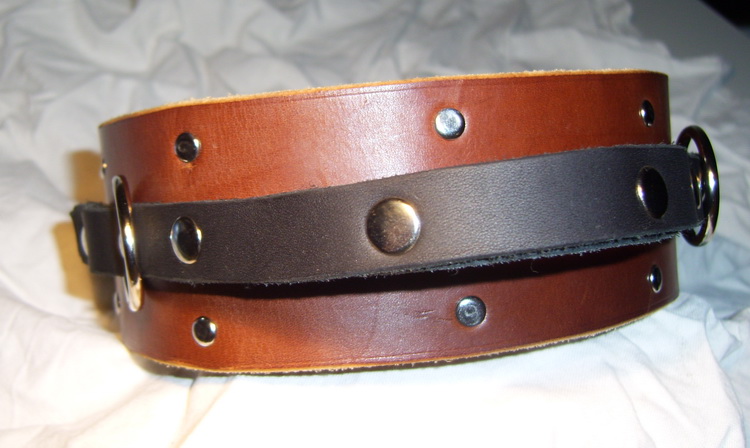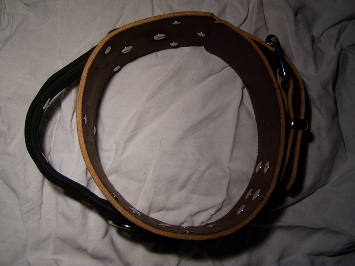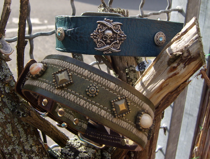 Letztens habe ich wieder einen richtig tollen Gürtel ergattern können. Einen moosgrünen Ledergürtel mit verschiedenen Nieten – daraus habe ich ein Halsband mit Schnalle und ein Zugstopphalsband fertigen können: