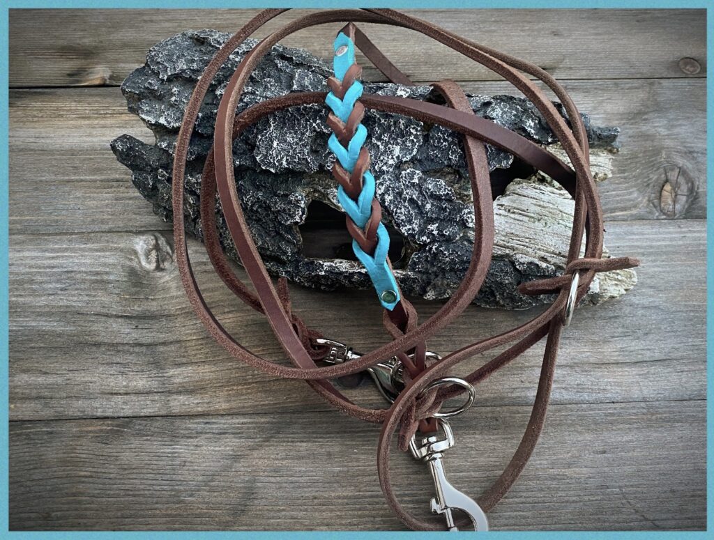 Alex & Elli Fettlederleine, dunkelbraun, 8mm Breite, Kontrastflechtung türkis, 2,40m Länge, Beschläge verchromt. Für Alex & Elli 🧡