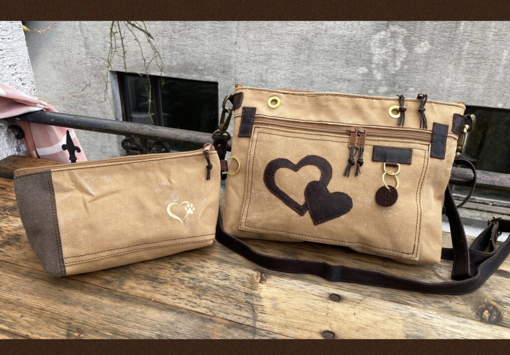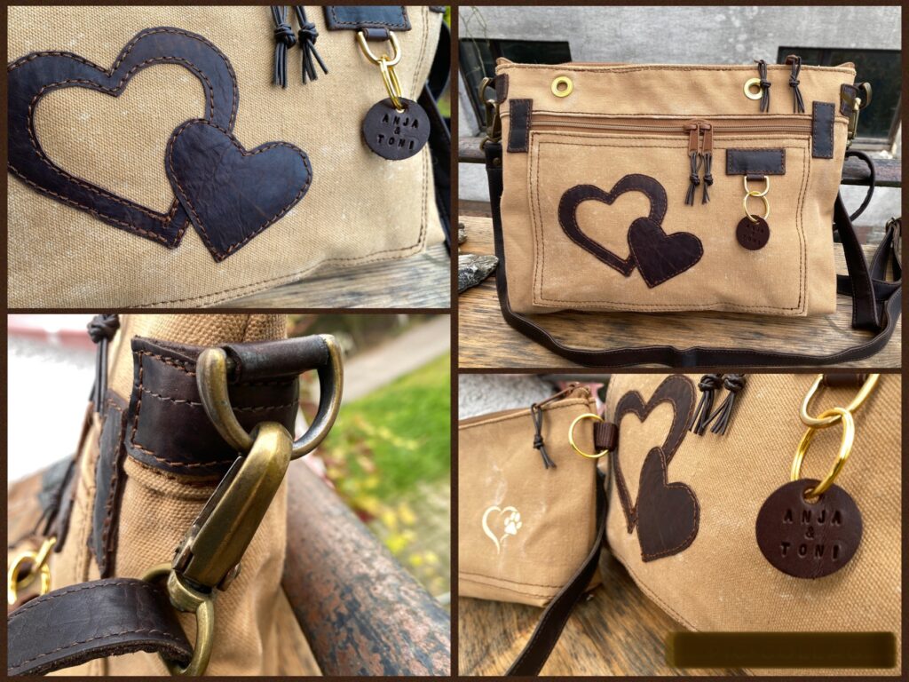 Für meine liebe Freundin Anja ist heute eine wunderbare Seesacktasche in einem hellen braun/beige-Ton mit dunkelbraunen Applikationen fertig geworden. Da Anja ihren Seelenhund Toni auch nach seinem Wechseln der Welten stets in ihrem Herzen trägt, habe ich als Applikationen Herzen gewählt und noch einen kleinen Lederanhänger mit „Anja & Toni“ punziert. Die Tasche hat die Maße von ca. 35cm x 25cm. Wie immer habe ich für die Herstellung alte, kaputte und/oder ungeliebte Dinge verwendet. Und meine besondere Zutat, die alle meine Produkte erhalten, fehlt natürlich auch hier nicht. Liebe 🧡