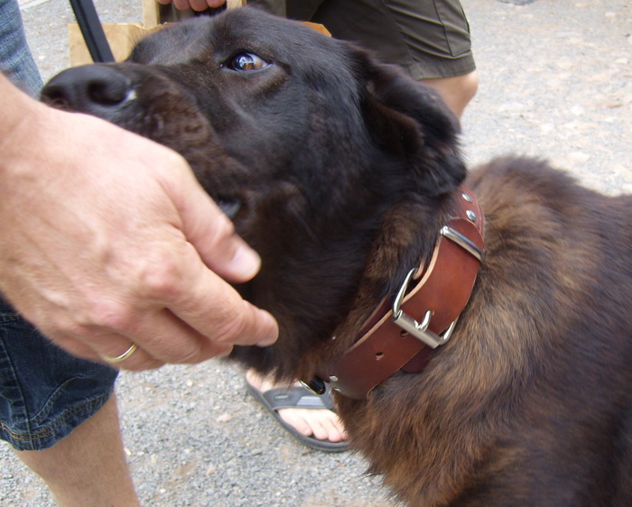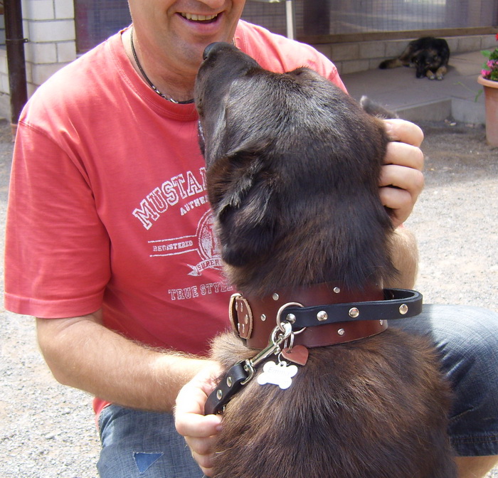 Am Samstag haben Heike, Robert und Jonas Alexia mit nach Hause genommen. Ab jetzt wird sie Emma heißen. Natürlich war ich gespannt wie ein Flitzebogen, ob das Halsband paßt und Leine und Halsband den Besitzern gefallen. Jaaaa, sie waren super zufrieden, was mich ja innerlich immer jauchzen läßt vor Freude. Hier ein paar Bilder von Emma mit Robert: