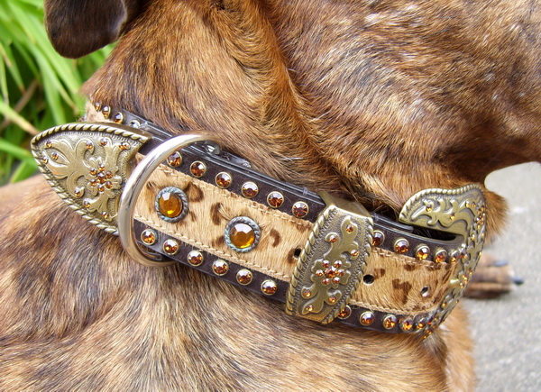 Barock rockt Dieses tolle Lederhalsband mit Straßsteinchen und Leoprint (gefärbtes Kuhfell) ist knapp 4cm breit und für einen Halsumfang von ca. 42cm bis 52 cm geeignet. Ich finde es ist ein echtes Sahnestückchen, welches zu fast jeder Fellfärbung paßt.