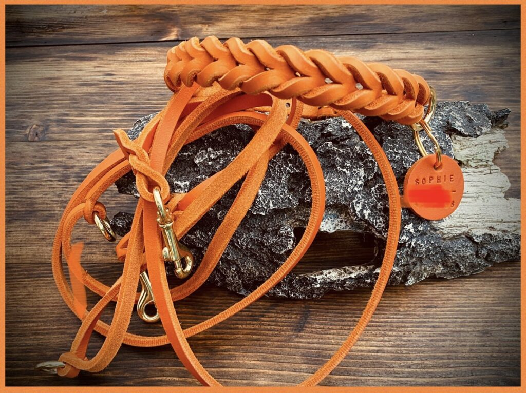 Für einen Rottweiler habe ich aus orangefarbenen Fettleder in 10mm☝️ Breite eine 2m lange, 3-fach verstellbare Leine gefertigt. Hier diesmal mit Messingbeschlägen.