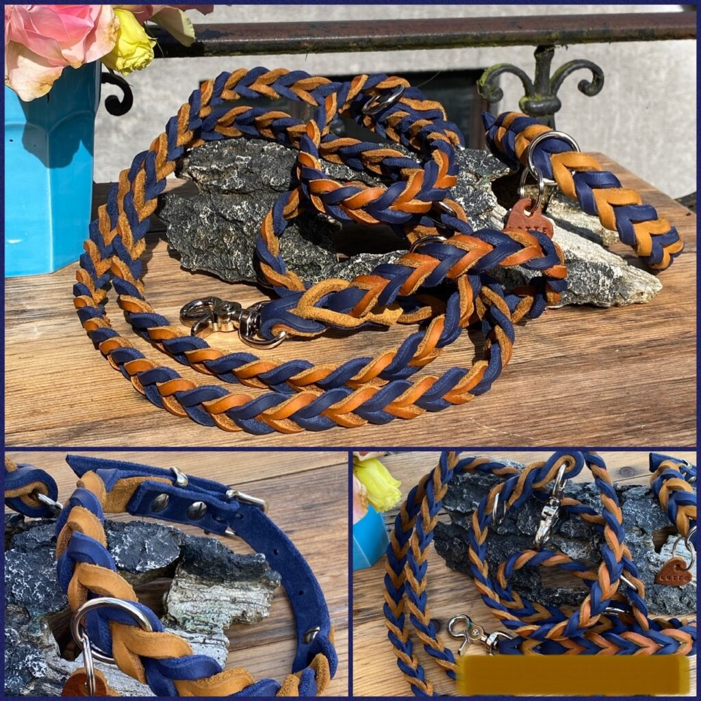 Die liebe Angelika wollte für ihre Lotte ein geflochtenes Halsband UND eine KOMPLETT GEFLOCHTENE Leine mit 2m Länge. Dies bedeutete für mich, 200 Schlitze zu machen und 200x Leder durch die Schlitze zu ziehen. Ich habe jetzt endlich fertig 🥵. Hier das Ergebnis: