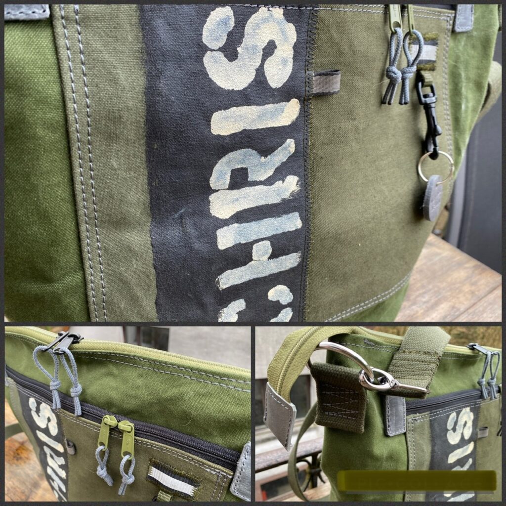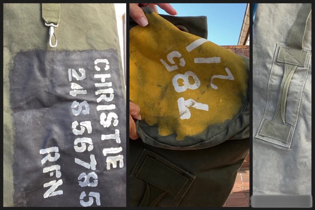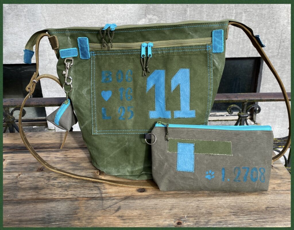 So. Nun ist sie fertig. Die Chris-Tasche. Das „Chris“ – eigentlich „Christie“ – wurde von einem Soldat auf den Seesack gepinselt. Dieser Seesack ist schon längst verarbeitet aber das Wort „Christ“ blieb übrig. Na und dann sprach mich Ellen an. Ihr Mann, ein Berufssoldat, heißt Chris. Soll ich noch mehr schreiben? Passt halt wie Ar… auf Eimer. Das fand auch Ellen. Das kleine Anhängerchen steht für Ellen aus Frau, Mutter, Familienmanagerin.