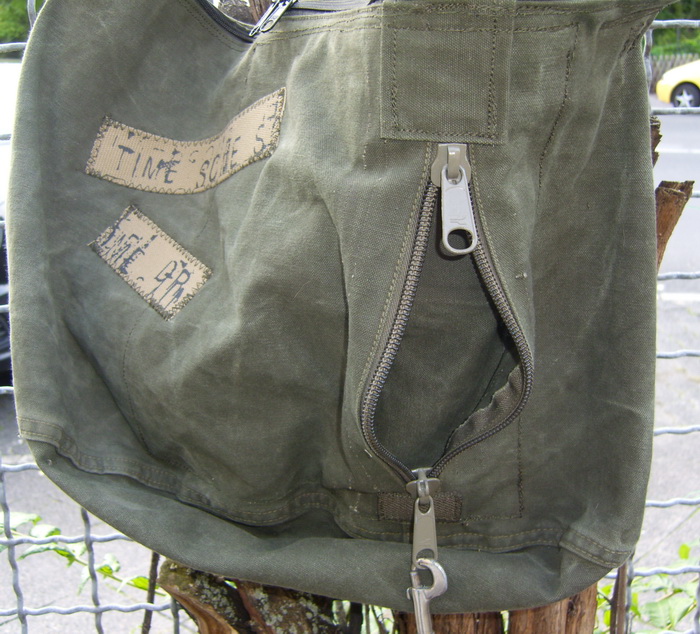 Der vordere Reißverschluß ist der originale Reißverschluß von der Bundeswehr. Innen habe ich Stoff gegen genäht, so dass eine Eingrifftasche entstanden ist. Natürlich gibt es auch hier wieder ein Sicherheitstäschchen an einem Bändchen, welches mit dem abnehmbaren Taschengurt zur Bauchtasche oder Umhängetasche umfunktioniert werden kann. Das vordere Dekor ist aus einem alten Canvasgürtel entstanden und an dem Reißverschlußzipper hängt der Teil einer alten Hundelederleine.