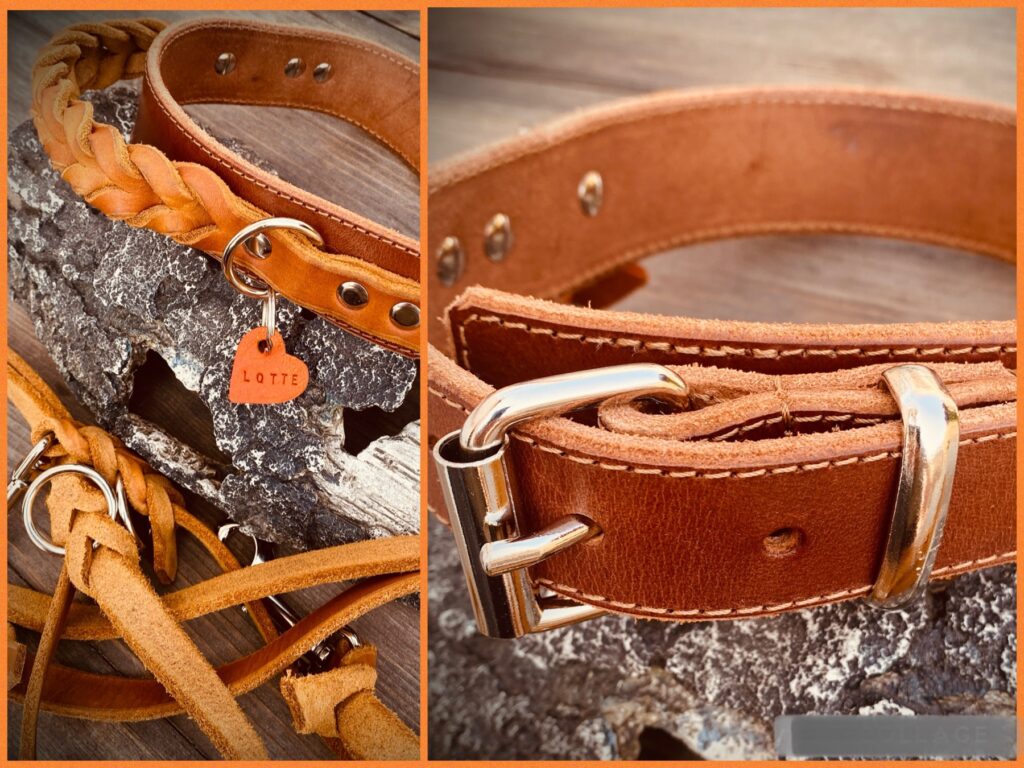 Das Lottekin ist nun doch etwas zierlicher geblieben, als anfänglich gedacht und hat sich auf 44cm Halsumfang eingependelt. Daher musste ein neues Halsband her. Aber bitte mit Griff. Hier ist es nun: 4cm breit, die Enden verjüngt auf 3cm, aus Sattlerleder mit geflochtenem Griff aus cognacfarbenen Fettleder. Die Schnalle ist ebenfalls mit Leder unterlegt. Und Azur Üben gab es noch eine kleine Apportiertasche dazu.
