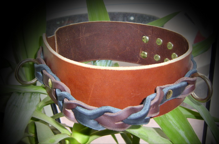 Dunja H. hat von ihrer Mama ein neues Halsband geschenkt bekommen. Mamas Wunsch war es, dass die Beschläge von Dunjas neuem „Arbeitshalsband“ gülden sein sollen. Daher habe ich für das schicke Mädchen dieses Mal alle Metallelemente aus Messing (bzw. vermessingt – Nieten) gewählt. Die Schnalle ist , wie bei Alexias Halsband, mit Leder unterlegt, die Ringe für die Leine sind rechts und links vom Griff und außerdem habe ich den Griff zweifarbig geflochten. Das ist das Ergebnis: