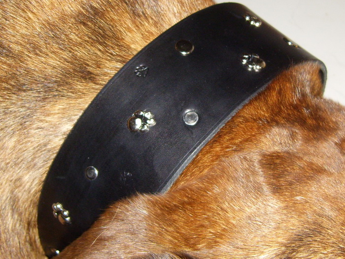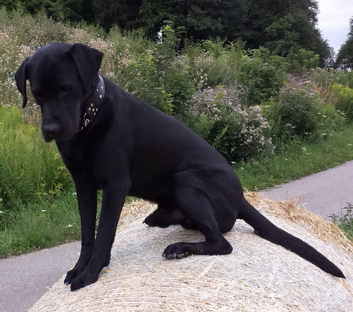 Der hübsche Grisu hat seit einigen Tag sein neues Collier und es steht ihm ausgezeichnet. Ein robustes schwarzes Vollederzugstopphalsband mit Pfotenapplikationen: