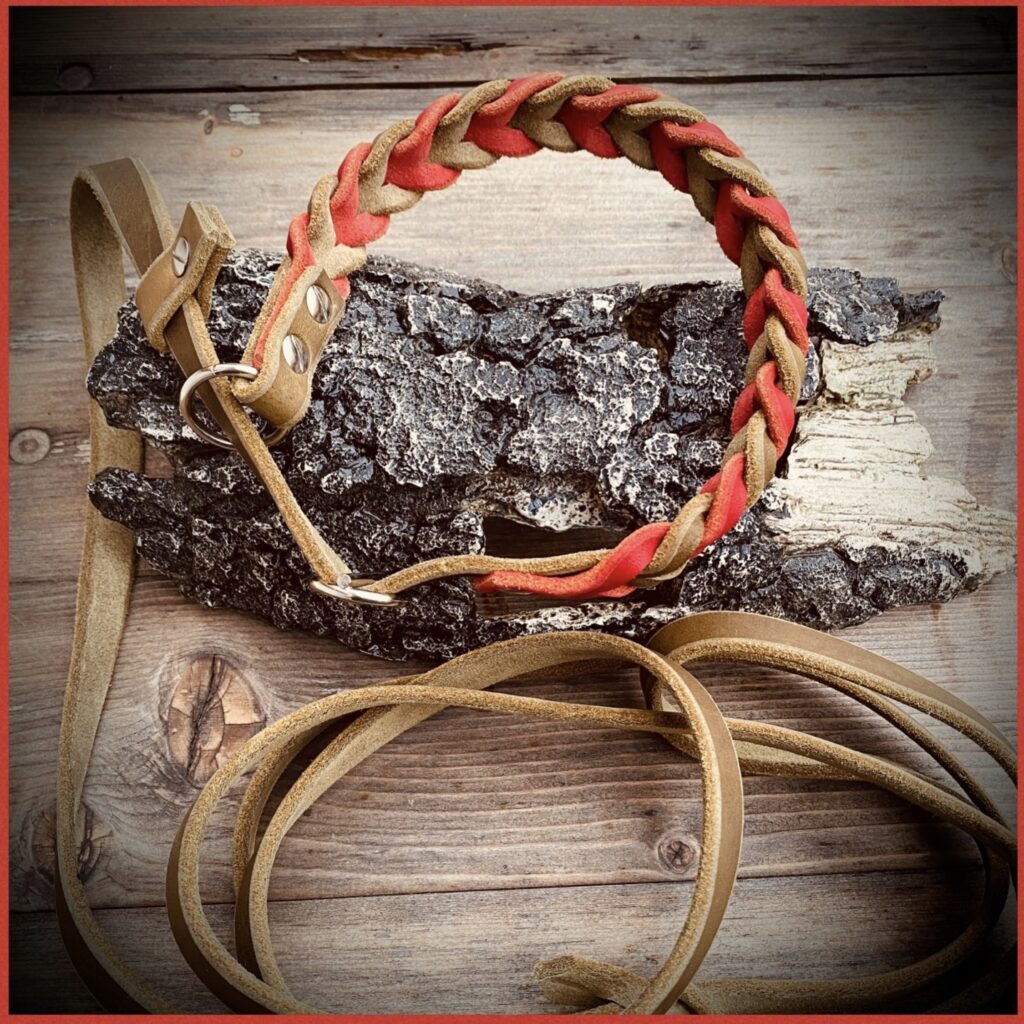 Gleich zweimal hintereinander wurde an mich der Wunsch herangetragen, eine Retrieverleine zu machen, die eine etwas breitere Halsung hat. Mein Vorschlag: Die Halsung zu flechten. Gerne auch zweifarbig. Vorschlag angenommen! Für Dante ist eine dunkelbraune Leine mit braun/türkisfarbener Halsung entstanden. Und da das Frauchen Emily gerne einen Karabiner am Ende haben wollte mit zwei Ringen, um die Länge der Leine zu verstellen, habe ich auf Wunsch die Ringe auch mit Kontrastflechtungen in Türkis versehen: