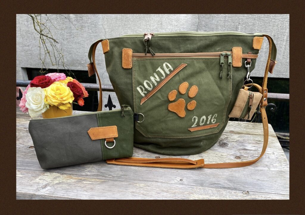 Heute ist die Tasche für die liebe Bettyann fertig geworden, die sie mit dem Namen und dem Geburtsdatum ihrer Hündin personalisiert haben wollte. Gesagt – genäht – gestempelt. Wie immer unter Verwendung alter, kaputter und/oder ungeliebter Dinge.