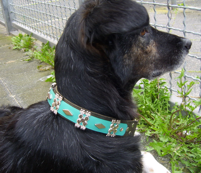 Außerdem habe ich noch ein neues Windhundhalsband aus dem supersoften Fettleder gemacht; diesmal mit petrolfarbenen Herzen, auch wenn es auf dem Foto eher türkis aussieht…