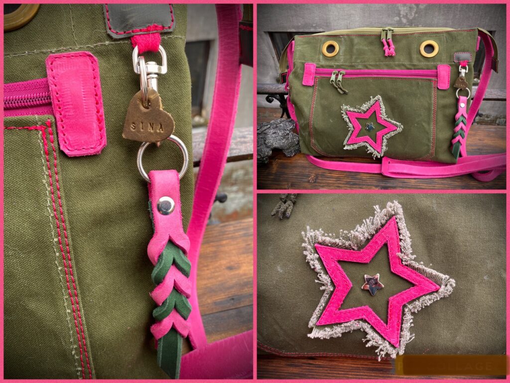 Ines hat sich eine olivfarbene Seesacktasche mit einem Stern und pinkfarbenen Applikationen gewünscht. Diesen Wunsch habe ich ihr sehr gerne erfüllt. Wie immer habe ich weitgehend alte, kaputte und/oder ungeliebte Dinge zur Herstellung verwendet.