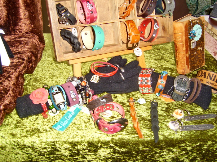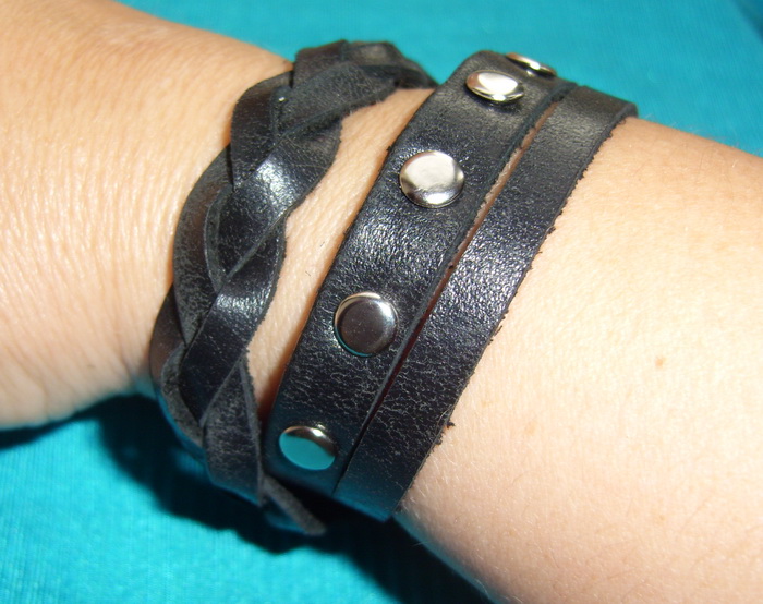 Zum Ende hin hatte ich eine sympatische Kundin, die ein echt interessantes Armband trug, was ich in meiner Werkstatt ähnlich „nachgebaut“ habe: Am Handgelenk sieht es aus wie zwei verschiedene Lederarmbänder; einmal geflochten, einmal mit Nieten…
