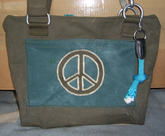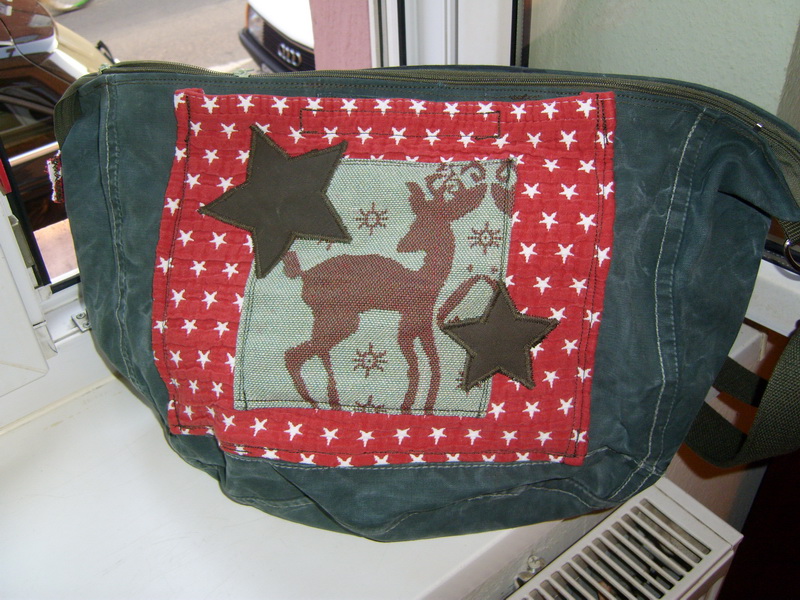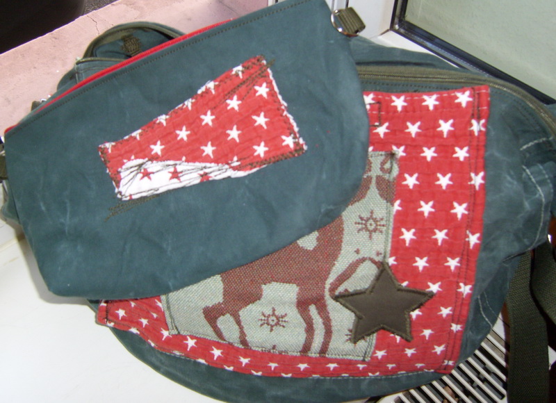 Ein „Weihnachtssack“ im Frühling. Egal! Der Taschensack ist aus meinem geliebten petrolfarbenen Seesack. Die aufgesetzte Tasche ist aus Heikis alter Couchüberdecke und einem Kissenbezug. Während eines Seminars hat die Tasche Susa prima Dienste geleistet wie man hier sieht.