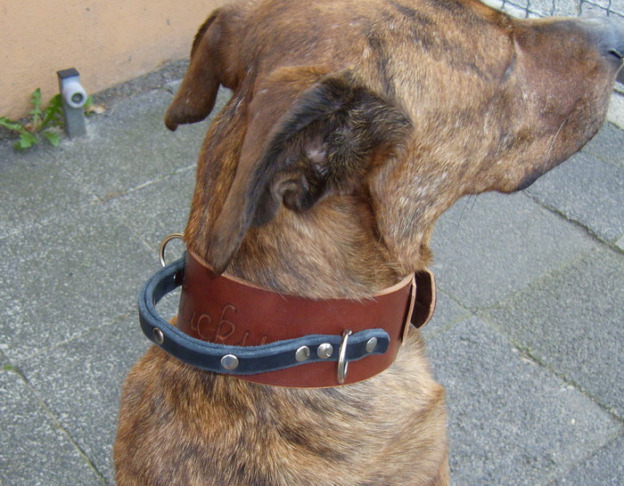 Gerlindes Lucky wird gerade zum Therapiehund ausgebildet und wird zukünftig u.a. mit Kindern arbeiten dürfen. Dafür hat sich Gerlinde ein Halsband mit Griff gewünscht, an dem die Kinder den Lucky-Star festhalten und führen können. Ich habe hier besonders auf die Weichheit des Leders geachtet und für den Griff ein entgratetes Fettleder verwendet, damit es für die kleinen Kinderhände komfortabel zu greifen ist. Rechts und links vom Griff ist ein Ring, denn als Belohnung dürfen die kleinen Patienten Lucky anleinen. Na und damit jeder gleich weiß, wie der Traumhund heißt, hat sich Gerlinde Luckys Namen in geschwungener Schrift und dem Griff gewünscht. Laura war so nett, und hat für die Fotos Luckys Halsband Probe getragen:
