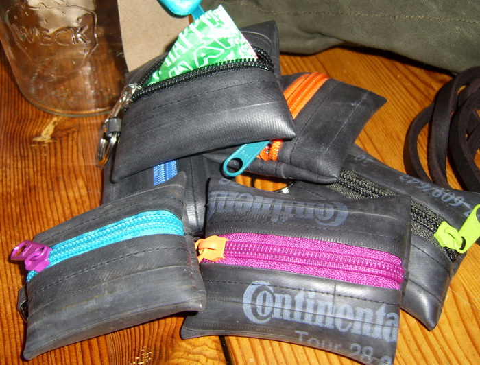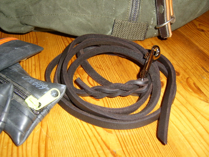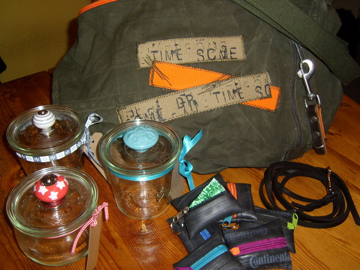 Also… im Grunde war es kein Überraschungspaket und dann wieder doch. Im Paket an Susa waren die Sachen, die sie gerne von mir geschickt haben wollte, aber sie wußte von keinem einzelnen Stück, wie es letztendlich aussieht. Inzwischen ist das Paket angekommen und ich darf hier endlich die Bilder posten. Im Paket war eine Seesacktasche, drei Weckgläser mit Knauf, eine ganz leichte, schlichte, dünne Fettlederleine zum Longieren mit Hunden und sechs kleine Fahrradschlauchtäschchen gefüllt mit Kotbeuteln: