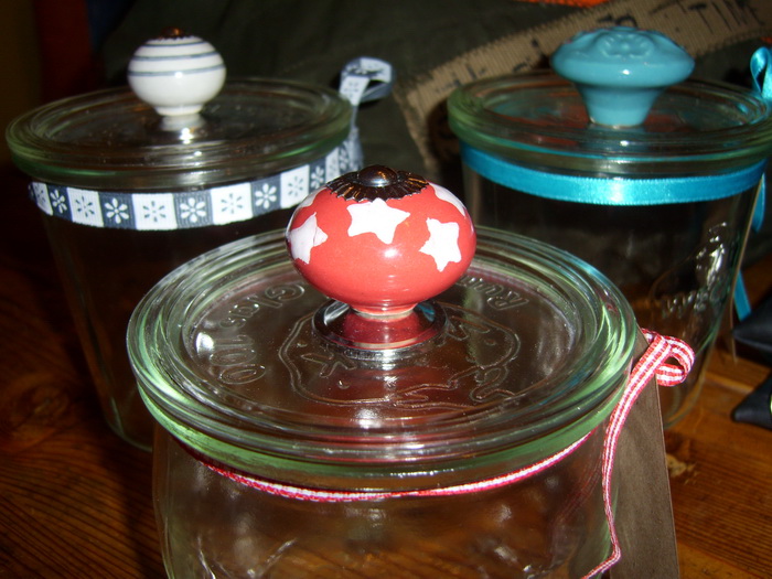 Ich hatte Susa von unserer „Seesternaktion“ am Osterwandertag erzählt und sie fand die Idee mit den Gläsern so toll, dass sie auch welche haben wollte, ohne zu wissen, welche Farbe und Form die Knäufe haben werden. Nachdem sie ja von mir die Weihnachts-bambi-stern-tasche mit weißen Sternen auf rotem Grund bekommen hat, war der eine Knauf quasi der „Susa-Knauf“:
