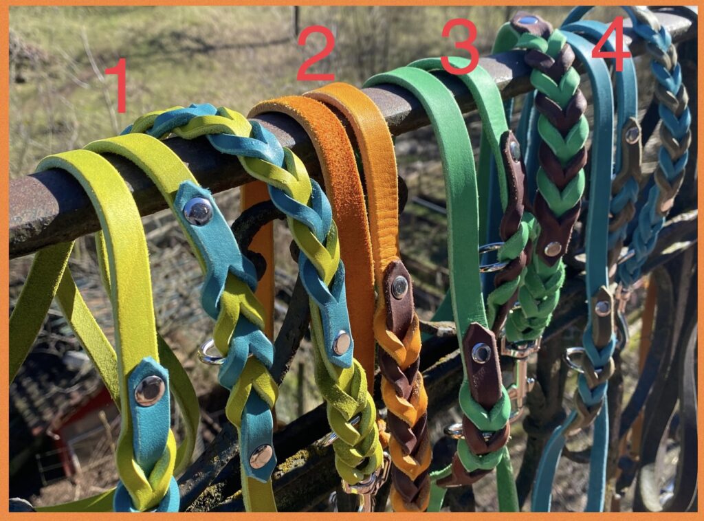 Die hier abgebildeten Leinen sind alle 2m lang, 3-fach verstellbar, haben eine dreifache Kontrastflechtung und unterschiedlich Breiten.