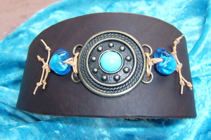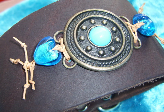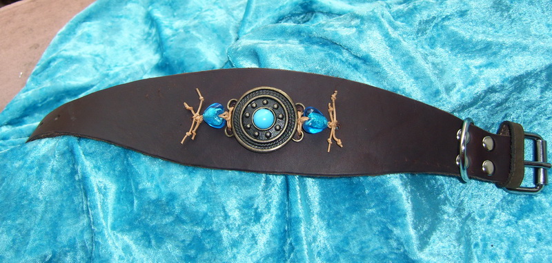 Mittig sitzt ein Metallmedallion, welches ursprünglich als Glied eines Gürtels gedient hat, und rechts und links davon habe ich türkisfarbene Glasperlen in Herzform mit Lederbändchen befestigt. Dieses Halsband hat einen Schnallenverschluß – es läßt sich aber auch prima als Zugstopphalsband fertigen. Dazu benötige ich dann jedoch wie immer den korrekten Halsumfang eures Hundes.