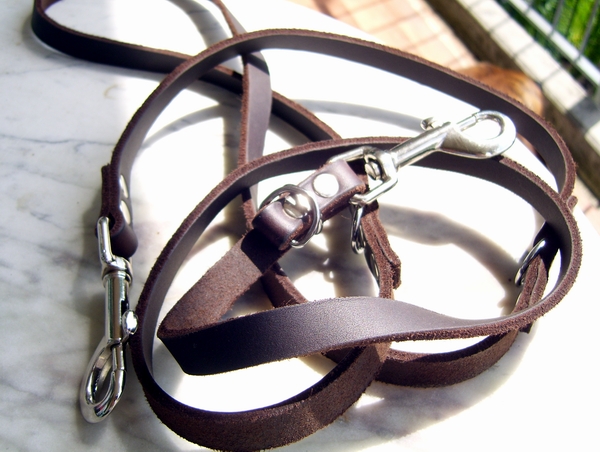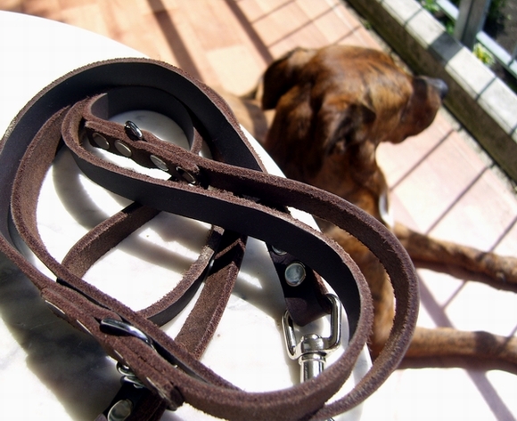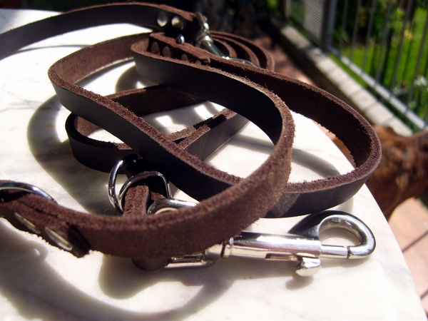 Längere Zeit habe ich im Netz und auch in Tierhandlungen nach einer schönen, weichen, anschmiegsamen und preiswerten Führleine für mein Streifen-Tütü geschaut. Ohne Erfolg. Im Netz gibt es zwar reichlich Auswahl an Fettlederleinen, aber die Befestigung der Karabiner und D-Ringe wird durch Einflechten erreicht. Und das gefällt mir nicht, weil die Leine an diesen Stellen relativ dick wird. Ich wollte gerne eine genietete Leine. Also habe ich mich nun doch daran gemacht und mir meine eigene Leine „gebaut“. Nun bin ich in Besitz einer schönen, schmalen (14mm breit), 3-fach verstellbaren, dunkelbraunen Leine von knapp 2m Länge.