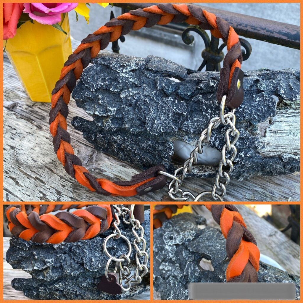 Zugstopp Zwischen all den Taschen, wird ab und zu auch mal wieder ein Halsband fertig. Für mich eine schöne Abwechslung. Zugstopp mit Kette aus dunkelbraunem und orangefarbenen Fettleder geflochten